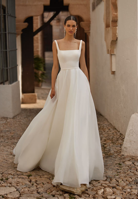 Right on trend, crepe bodice for a perfect fit, square neckline and scoop back. The narrow band at the waist slims the waist. The stunning organza A-Line skirt make for the perfect minimalist gown with the extra WOW.